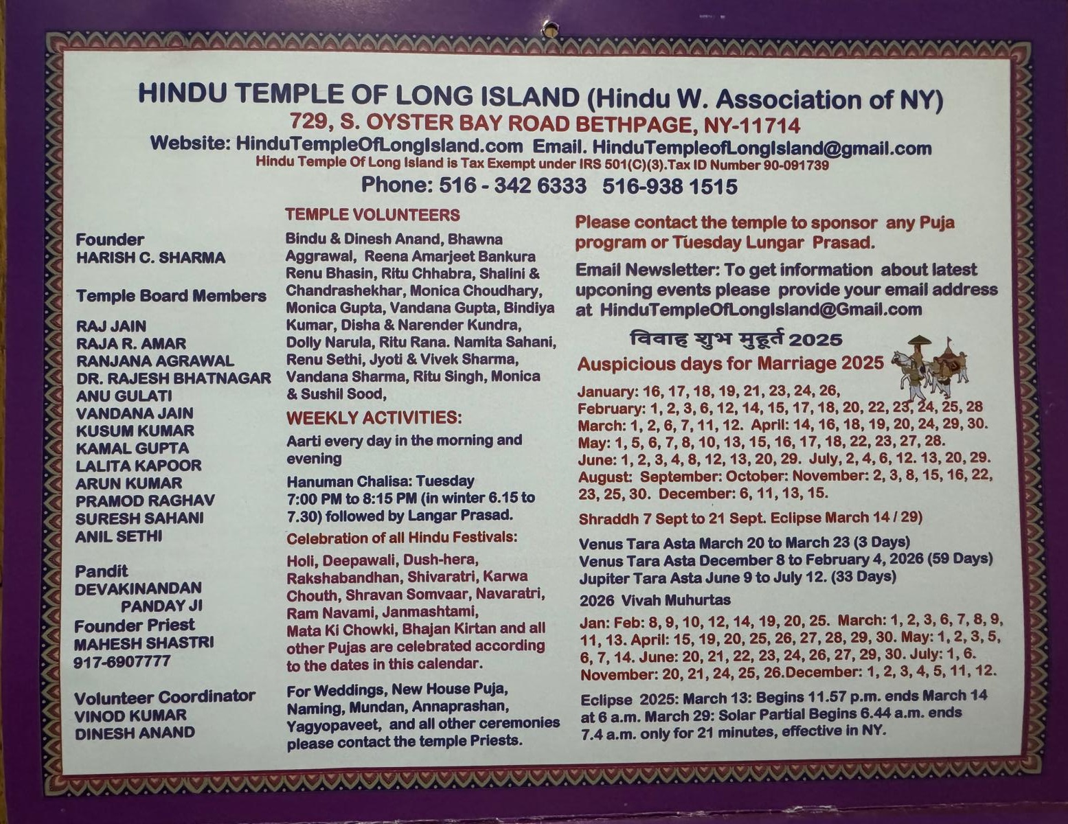 Temple Calendar of Events